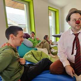 In Wohngemeinschaften leben die Kinder unterschiedlichen Alters zusammen. Einer Großfamilie gleich mit vielen Geschwistern. Kinder von klein bis groß bilden hier das Publikum für den Clown. Es herrscht ein sehr familiäres Klima.